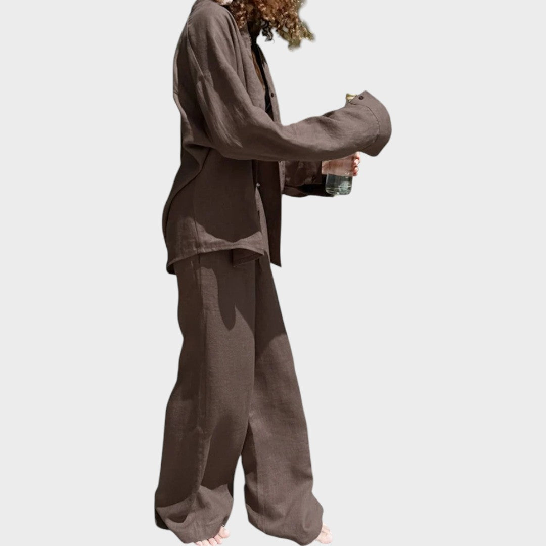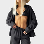Descubre el conjunto Luna en algodón de primera calidad: una camisa oversize a rayas, un versátil cropped top y unos pantalones de cintura alta y pierna ancha. Cada pieza tiene un corte ligero y un tacto suave, combinando comodidad y elegancia en un look urbano que combina con tu estilo. Perfecta para pasar del día a la noche con autenticidad y frescura.