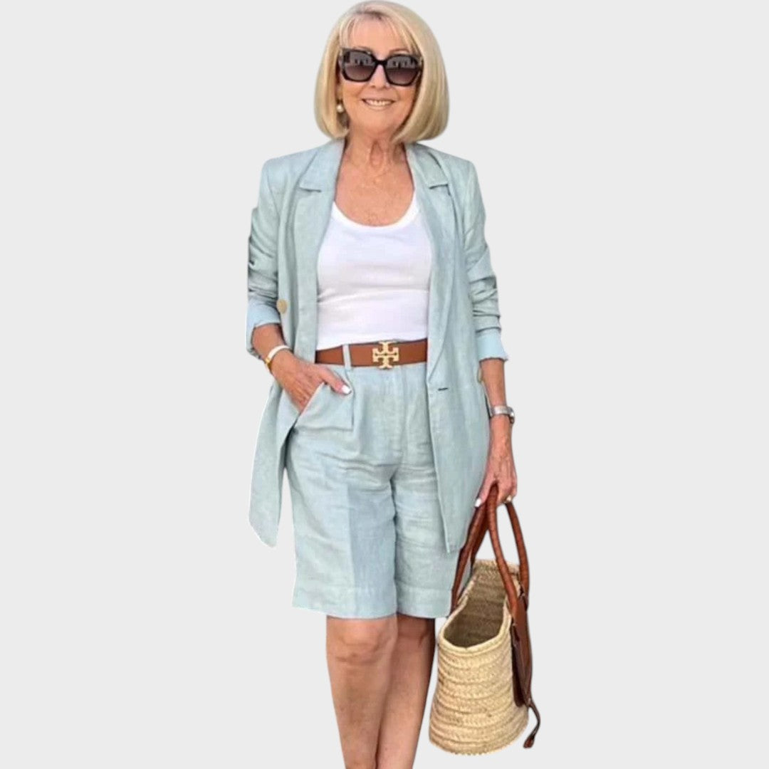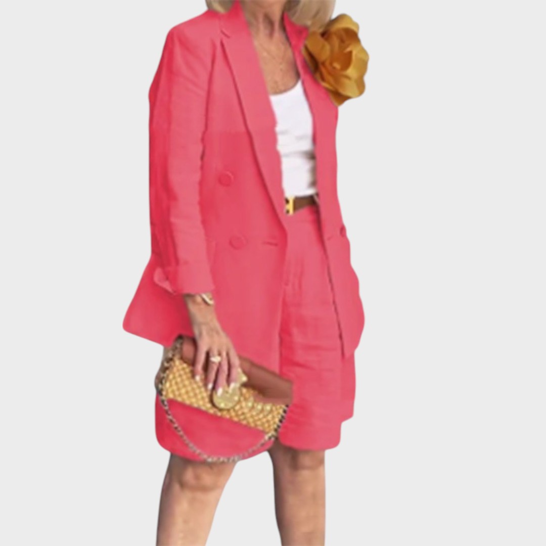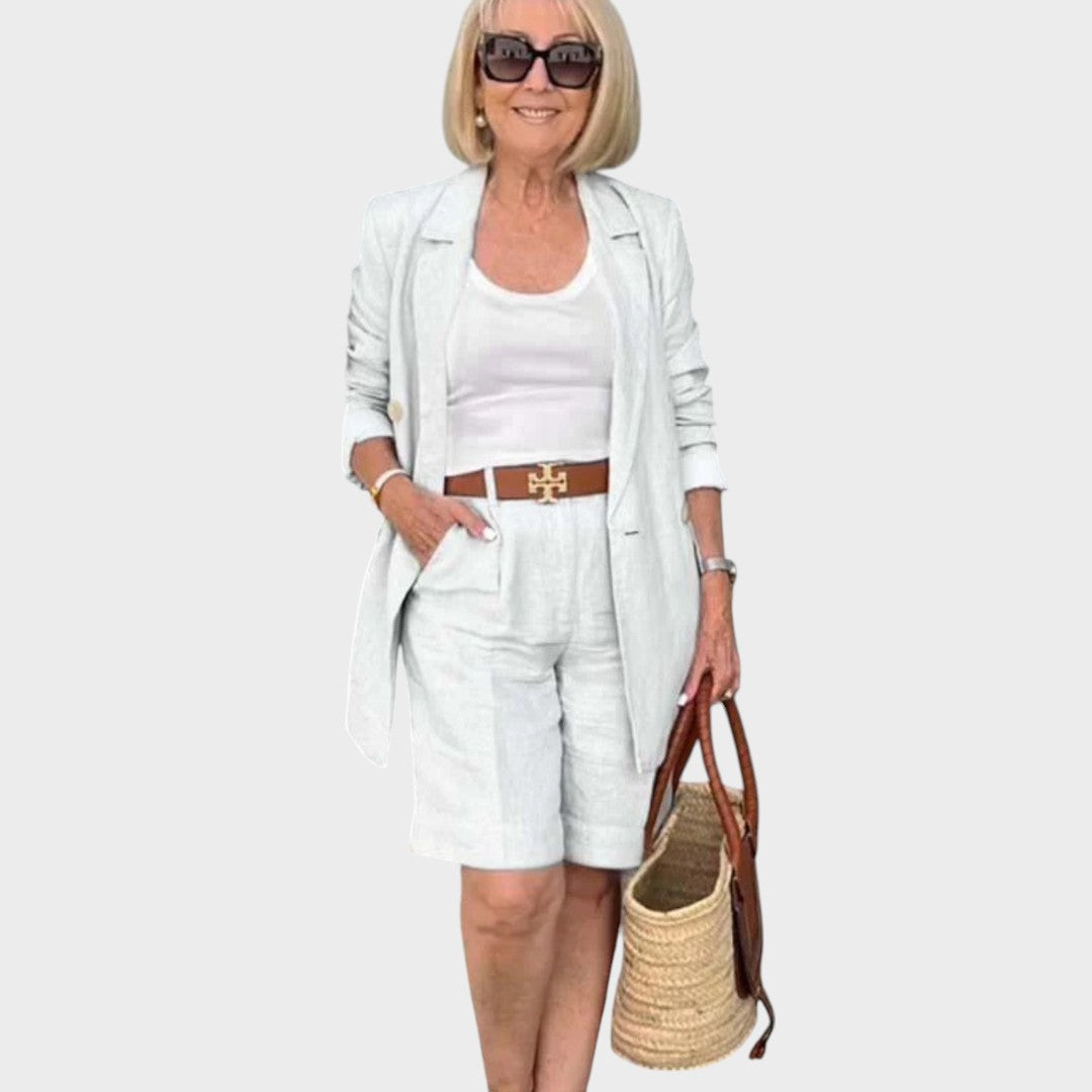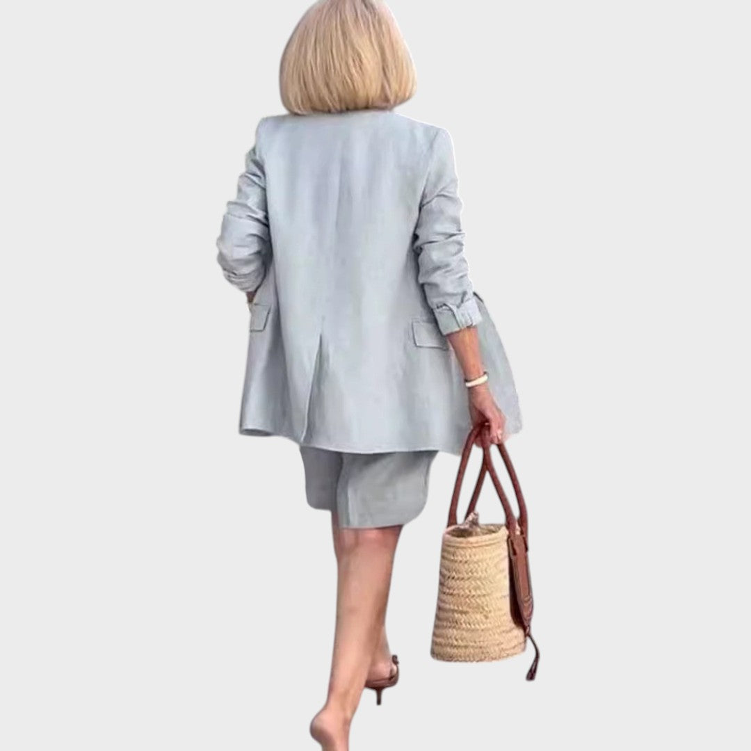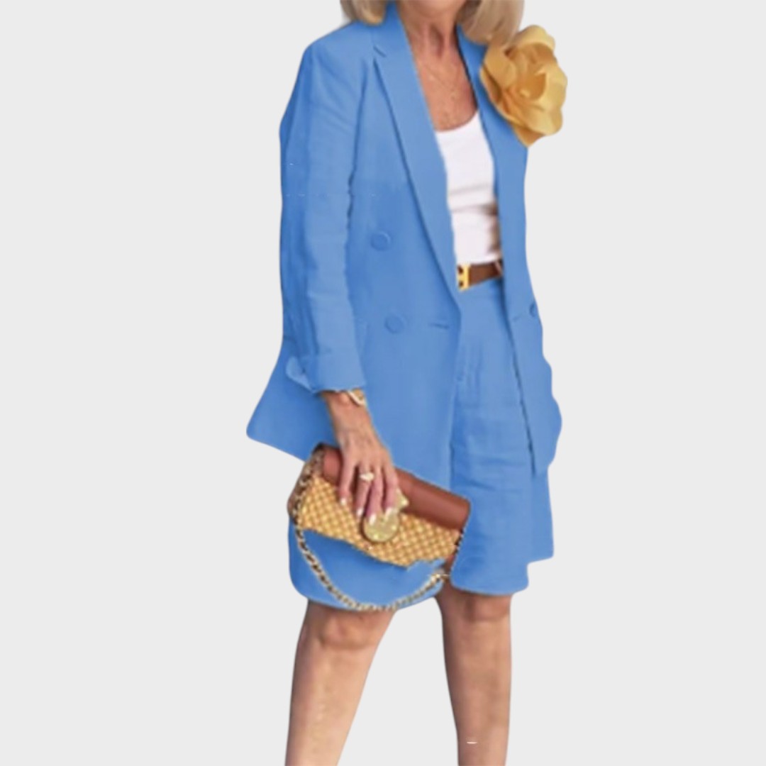 • Conjunto de dos piezas - Blazer con mangas ¾ y pantalón corto de cintura alta con bolsillos laterales.