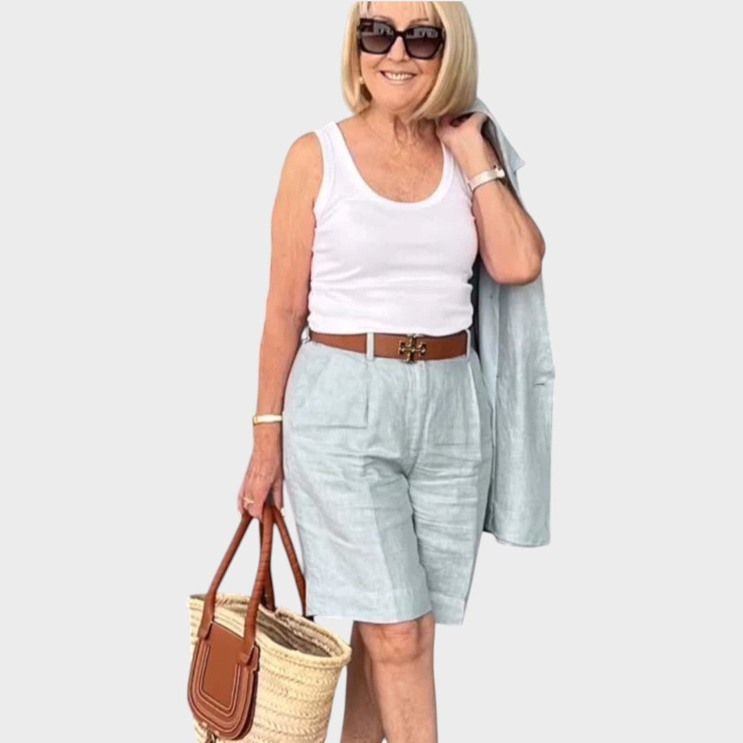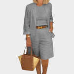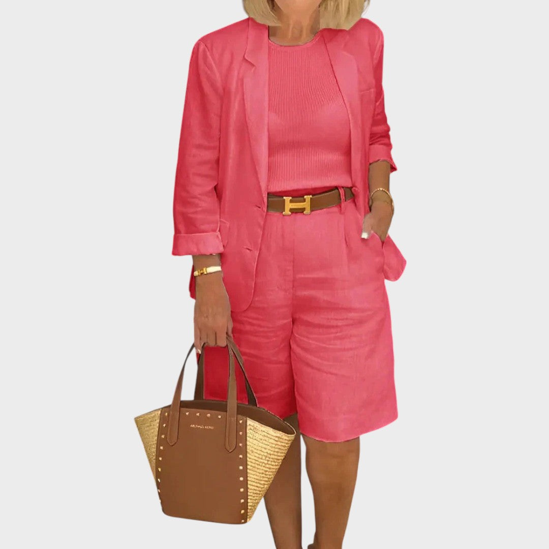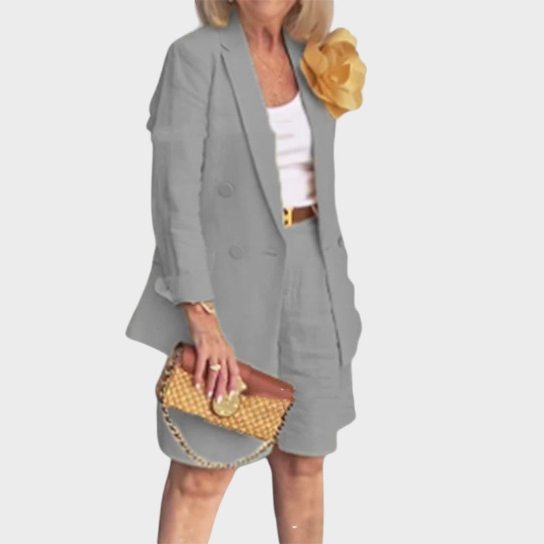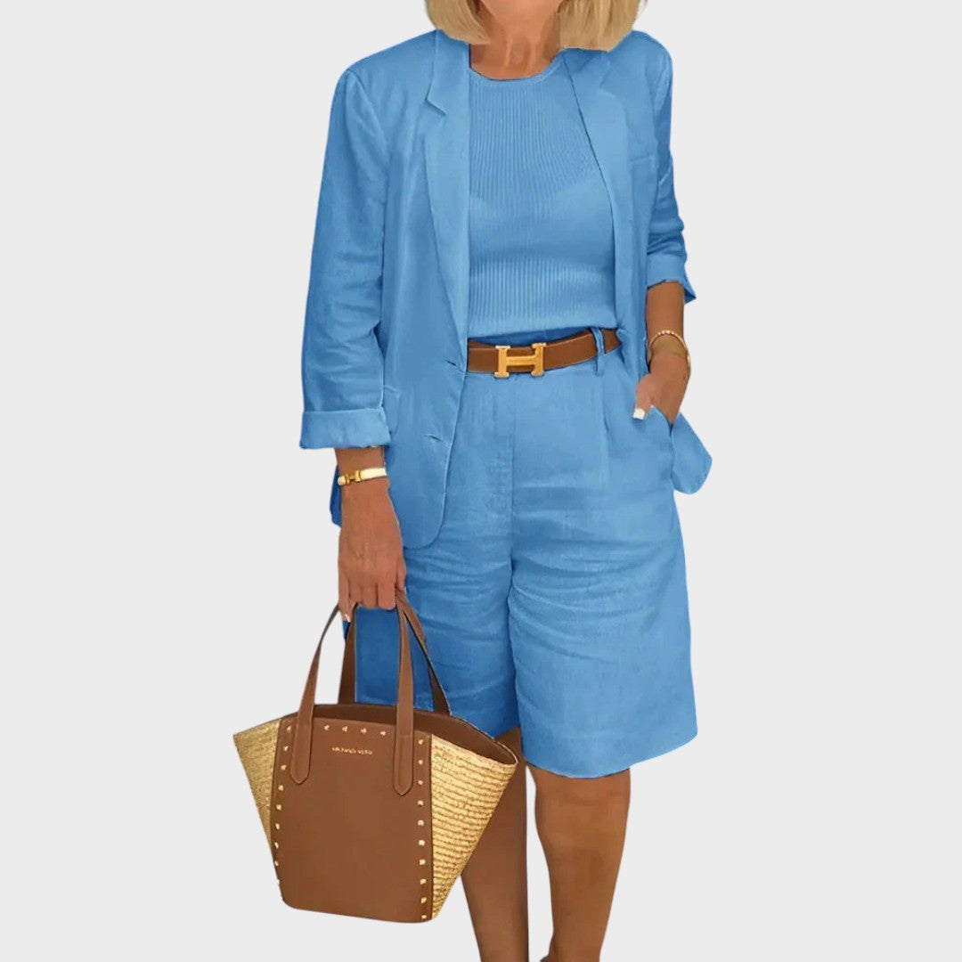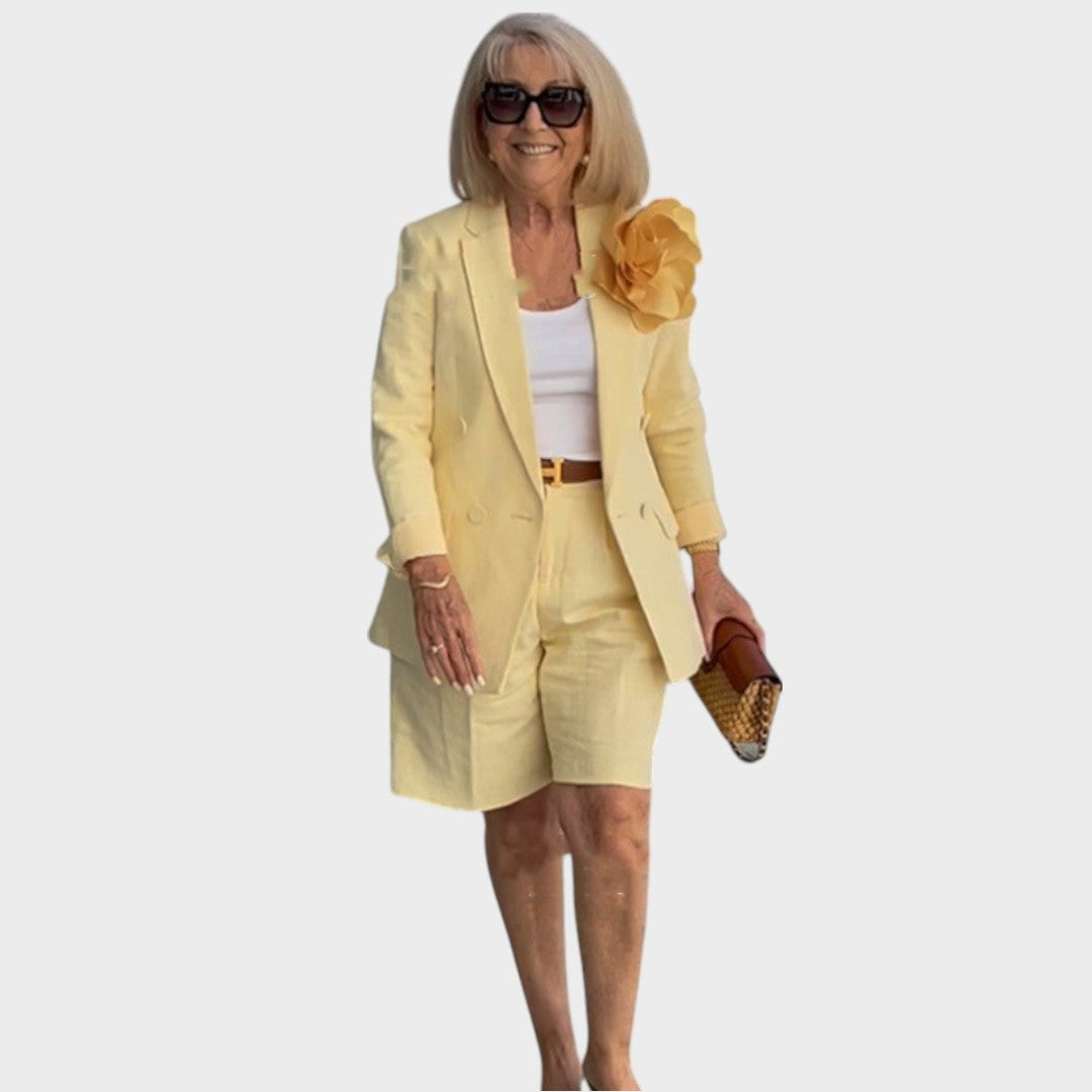 • Conjunto de dos piezas - Blazer con mangas ¾ y pantalón corto de cintura alta con bolsillos laterales.