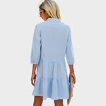 El vestido Shanna es la elección perfecta para los días soleados y los momentos relajados con un toque de elegancia. De corte fluido y diseño abotonado delantero, destaca por su estampado vichy azul claro que evoca frescura y feminidad. Las mangas 3/4 y el cuello ligeramente subido aportan un encanto desenfadado, ideal para el día a día o para ocasiones informales.